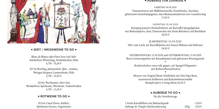 Nachdem aufgrund der bayerischen Verordnung die herrlichen Tafelrunden in illustrer Gesellschaft bis mindestens 20.04.2020 nicht möglich sind, freuen wir uns, Ihnen die AUBERGE FÜR ZUHAUSE anzubieten.