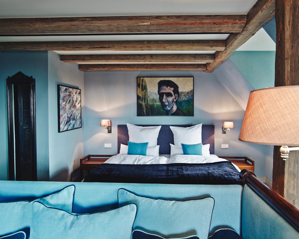 Das ist der Gipfel, denn die Juniorsuite „Christoph de Temple“ bietet die höchstgelegene Sauna der Region. Genießen Sie im türkisen Ambiente dieses Refugiums außerdem das barrierefreie Bad, den idyllischen Balkon mit herrlichem Ausblick oder auch das gemütliche Daybed. Gewidmet ist das Zimmer dem Neffen des Eigentümers der Auberge, Christoph de Temple. Seine Kunst, die um malerische wie musikalische Aspekte kreiste, vereint beides weitschauend und inspirierend. „Was mich interessiert“, hatte er oft betont, „ist eine Farbigkeit, die ähnlich funktioniert wie der Zusammenklang von Tönen in einem Akkord.“